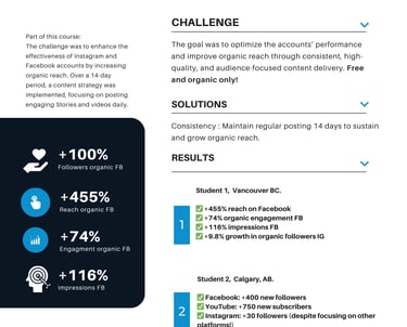 Our students don’t just learn the theory—they successfully apply practical strategies for growth! From reach and engagement to followers and views, their metrics are skyrocketing!