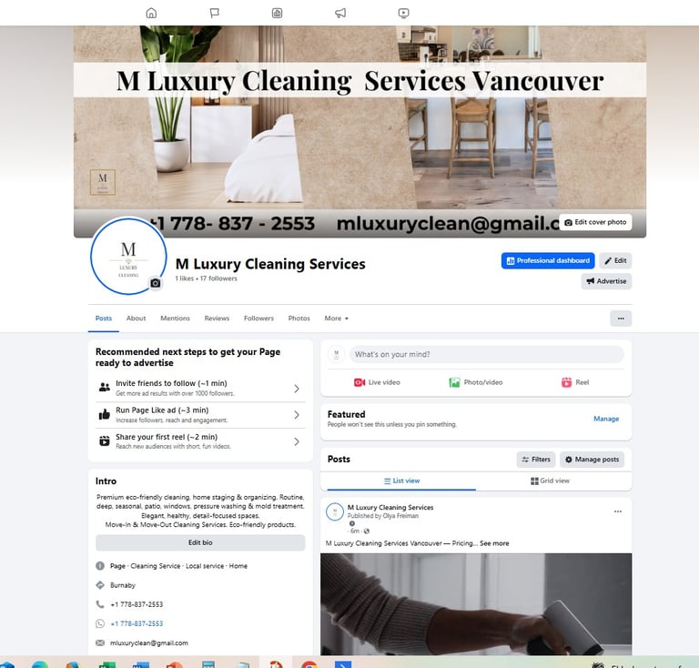 As a result, M Luxury Cleaning Services Vancouver received a fully developed brand identity and fully optimized Facebook Business Page, ready for customer acquisition, lead generation, and digital marketing campaigns. The client’s profile is professionally positioned to attract high-end residential clients and real estate partnerships.